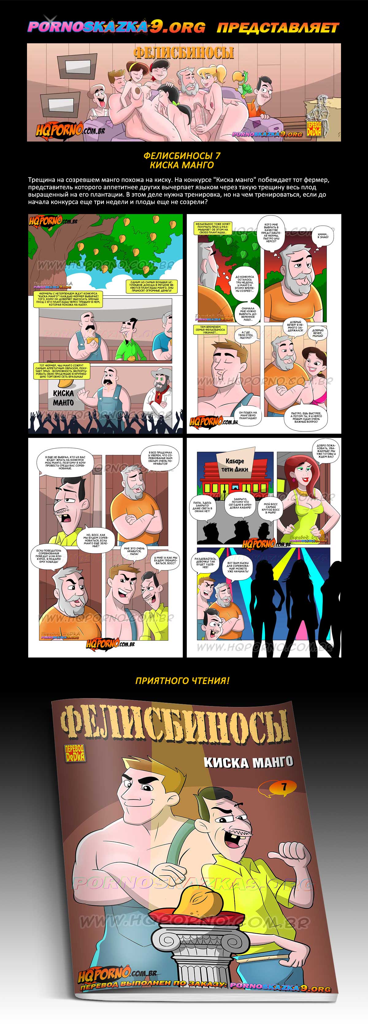 Порно комикс «Фелисбиносы. Часть 7. Киска манго.» Трещина на созревшем манго похожа на киску. На конкурсе «Киска манго» побеждает тот фермер, представитель которого аппетитнее других высосет через такую трещину весь плод выращенный на его плантации. В этом деле нужна тренировка, но на чем тренироваться, если до начала конкурса еще три недели и плоды еще не созрели?